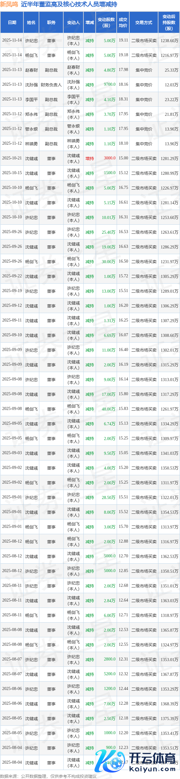 证券之星音书,字据11月17日市集公开信息、上市公司公告及来回所透露数据整理,新凤鸣(603225)最新董监高及关系东说念主员股份变动情况:2025年11月14日公司董事杨剑飞、董事许纪忠共减抓公司股份10.0万股,占公司总股本为0.0066%。变动时候公司股价下落1.32%开云体育,11月14日当日收盘报17.97元。