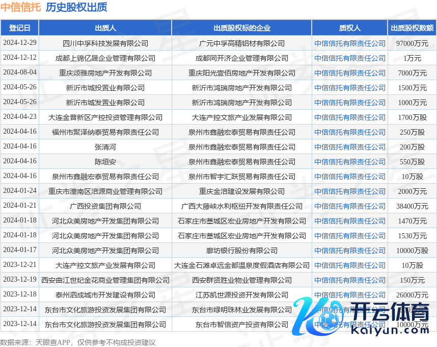 本站音书体育游戏app平台,笔据天眼查APP露出,在12月29日登记的一则股权出质信息(登记编号:510800202412300002)中,四川中孚科技发展有限公司出质其所捏有的广元中孚高精铝材有限公司股权,出质股权数额为97000万元,质权东谈主为中信相信有限职守公司。