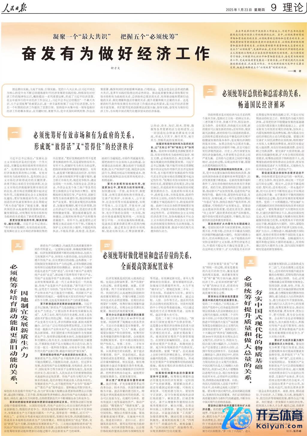 在旧年底举行的中央经济责任会议上,习近平总布告精良索求咱们党对经济责任的规矩性意志。其中,必须统筹好灵验市场和有为政府的干系、必须统筹好总供给和总需求的干系、必须统筹好培育新动能和更新旧动能的干系、必须统筹好作念优增量和周转存量的干系、必须统筹好进步质地和作念大总量的干系这五个“必须统筹”,充满辩证法,是习近平新时期中国脾气社会主义想想的态度不雅点方法在经济领域的天真体现。咱们要深切学习通晓,束缚进步意志水仁爱贯彻落实才略,振奋有为作念好经济责任,完成好高质地发展这一首要任务,以中国式当代化全面股东强国栽植、民族回答大业。今天的表面版刊发钟才文签字著述,巨擘准确解读五个“必须统筹”的深切内涵。