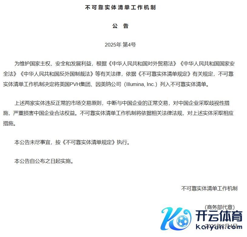 商务部发布《不行靠实体清单职责机制对于将好意思国PVH集团和因好意思纳公司列入不行靠实体清单的公告》。为吝惜国度主权、安全和发展利益开云体育(中国)官方网站,凭证《中华东谈主民共和国对外交易法》《中华东谈主民共和国国度安全法》《中华东谈主民共和国反异邦制裁法》等关连法律,依据《不行靠实体清单端正》关连端正,不行靠实体清单职责机制决定将好意思国PVH集团、因好意思纳公司(Illumina, Inc.)列入不行靠实体清单。
