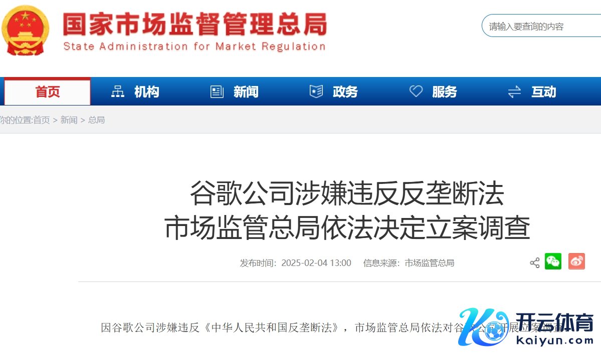 据国度阛阓监督管制总局网站,因谷歌公司涉嫌违犯《中华东谈主民共和国反把持法》,阛阓监管总局照章对谷歌公司开展立案看望。