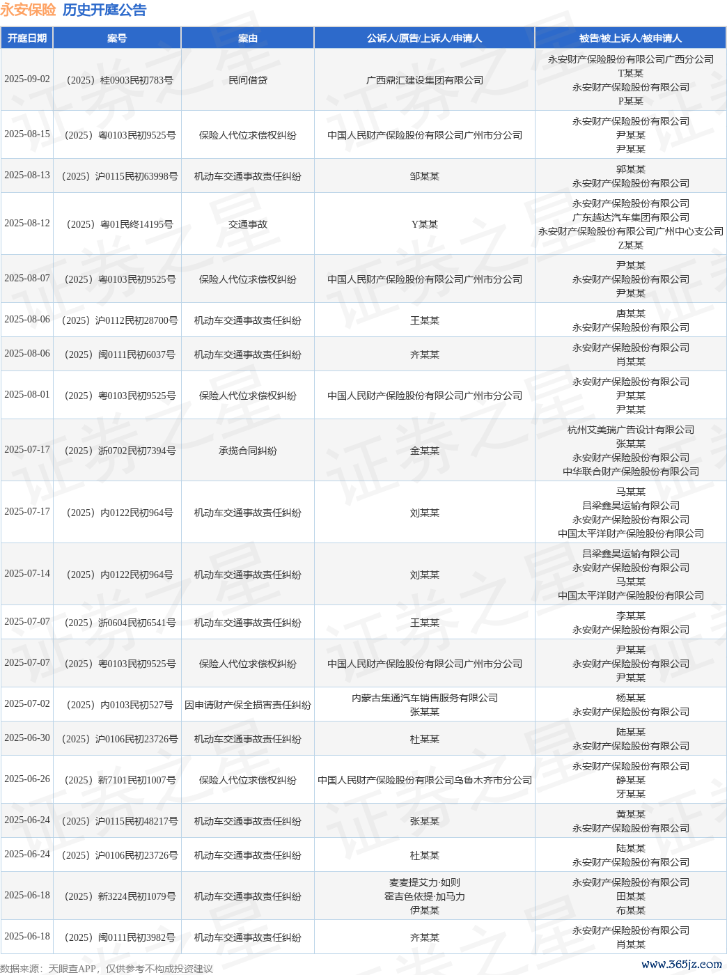 案号:(2025)粤01民终14195号审理法院:广东省广州市中级东说念主民法院案由:交通事故当事东说念主信息: 原告/上诉东说念主:Y某某 被告/被上诉东说念主:永安财产保障股份有限公司、广东越达汽车集团有限公司、永安财产保障股份有限公司广州中心支公司、Z某某开庭日历:2025年8月12日字据统计,近一年内以永安财产保障股份有限公司为当事东说念主的历史开庭公告有135则,其中案由为“天真车交通事故职守纠纷”的公告以72则居首,其次为“保障东说念主代位求偿权纠纷”有16则,“侵权职守纠纷”有9则。历史开庭公告(前20条)如下: