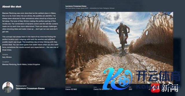网友攻讦其抄袭作秀的原作品为英国影相师劳伦斯 · 克罗斯曼 - 埃默斯(Laurence Crossman-Emms)在 2019 年红牛极限影相大赛获校阅类一等奖的作品,拍摄于英国威尔士,展现的是一位自行车带领员高速驶过水面,轮胎好意思满激起一派水花。克罗斯曼 - 埃默斯拍摄这幅像片用的是佳能 5D Mk3 相机加 16-35mm 2.8 镜头,他谈到这幅照片晌说,预先也曾构念念了很万古辰,终末在好意思满的位置和天气中拍下这幅画面。