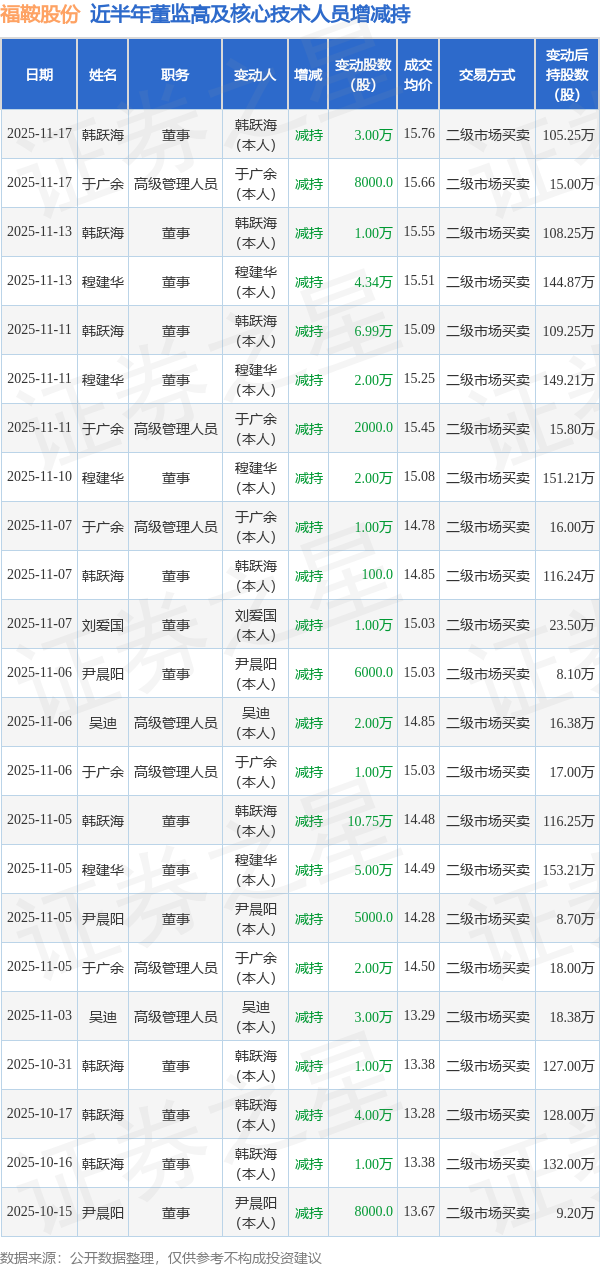 证券之星音书,阐发11月17日市集公开信息、上市公司公告及往返所败露数据整理,福鞍股份(603315)最新董监高及干系东谈主员股份变动情况:2025年11月17日公司高等处罚东谈主员于广余、董事韩跃海共减执公司股份3.8万股体育游戏app平台,占公司总股本为0.0119%。变动期间公司股价飞腾5.16%,11月17日当日收盘报15.69元。 福鞍股份近半年内的董监高及中枢时刻东谈主员增减执笃定如下: 福鞍股份的高管列表及最新执股情况如下: 该股最近90天内无机构评级体育游戏app平台。 海量资